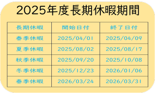 - 【お知らせ】学生の夏休み期間は8月3日(土)から8月18日(日)までです。職員の夏季休業は8月13日(火)、14日(水)、15日(木)です。